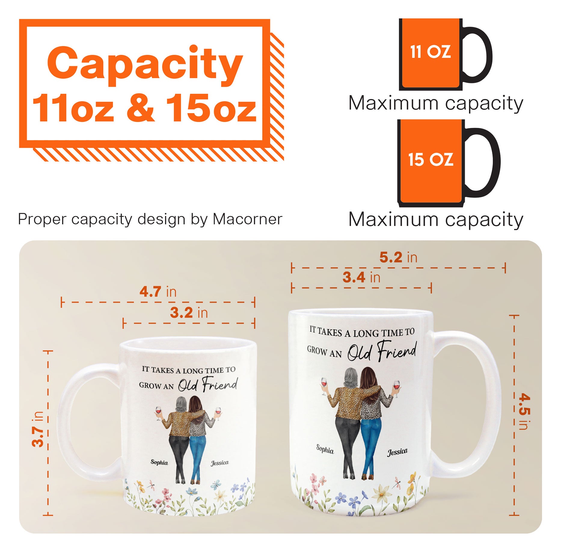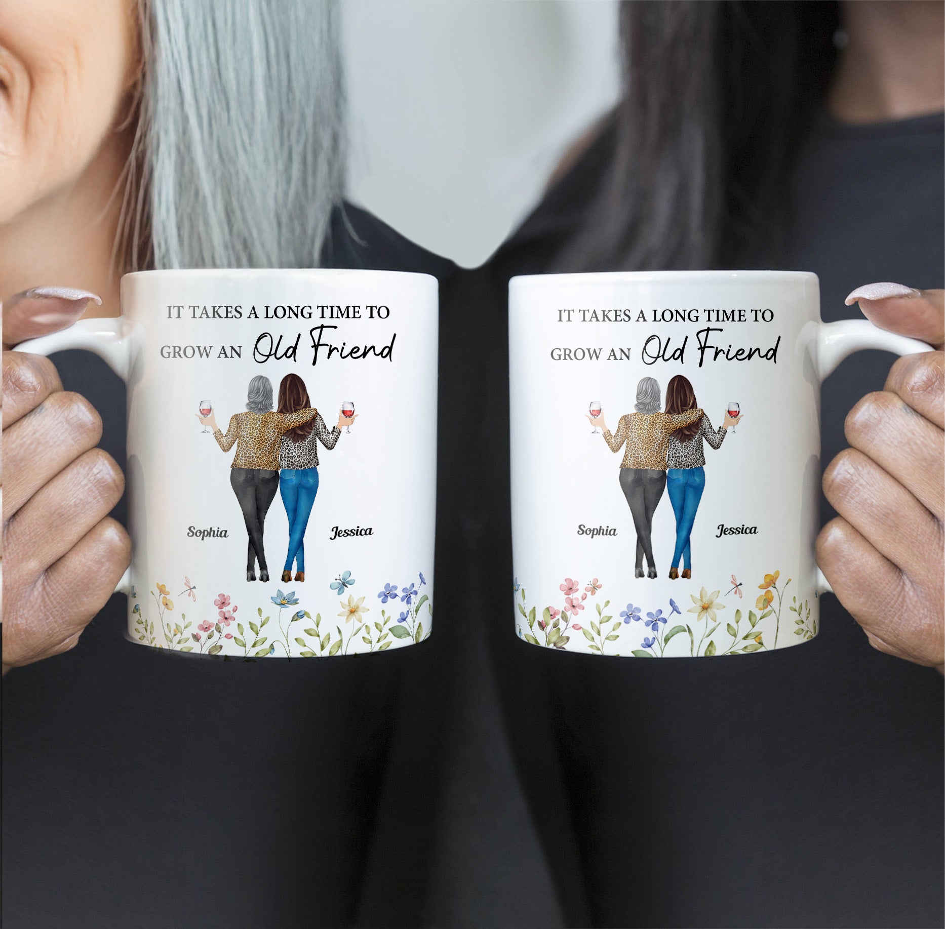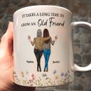 This personalized mug is the perfect gift to celebrate your lifelong friendship. Featuring a heartfelt quote, ‘It takes a long time to grow an old friend,’ it captures the beauty of shared memories. The custom illustration of two friends with their names adds a unique and personal touch. Ideal for birthdays, holidays, or simply to show appreciation for your bestie.